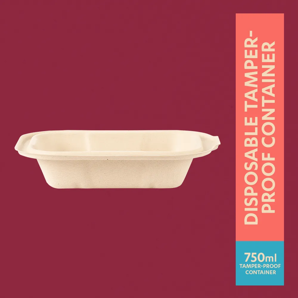 Fill it, glue it, and send every order with confidence. This 750ml tamper-proof delivery container with lid uses a glue-lock seal to keep biryani, burgers, desserts, and bowls secure. No leaks. No doubts. A no-plastic delivery container that protects presentation, reduces complaints, and keeps every order intact.